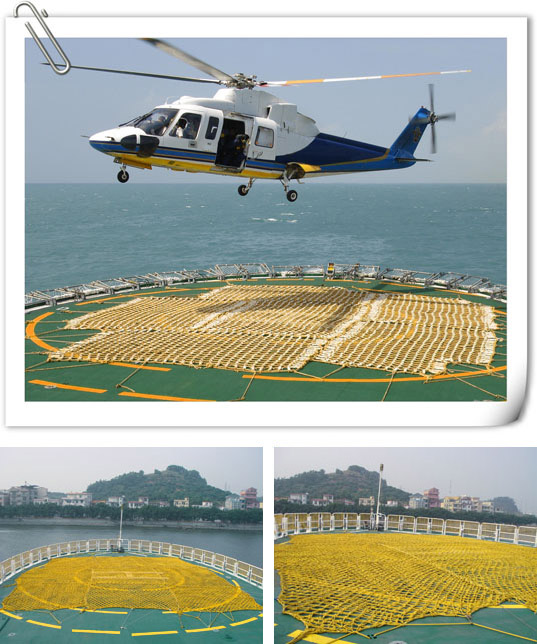 直升機(jī)平臺防滑網(wǎng),又叫飛機(jī)降落網(wǎng)、防滑網(wǎng):材質(zhì)一般采用馬尼拉繩、劍麻繩、尼龍繩等材料。網(wǎng)的尺寸一般有6M×6M10M×10M、12M×12M、15M×15M,網(wǎng)眼的尺寸為20CM×20CM,剛好可以卡住飛機(jī)的輪子,防止飛機(jī)被大風(fēng)吹移,甚至墜落海里。